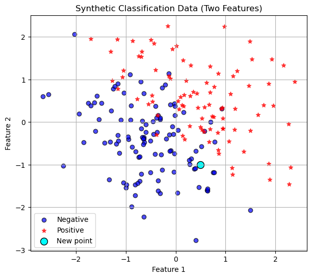 In this case the training data is existing data points with any number of features. In the picture above we have two features so we can plot the data points in 2-dimensions. Now given a new points we do the following algorithm.
