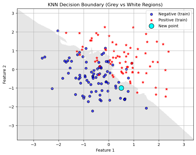 So in the picture above, lets say we choose \(K=3\), then we would look at the three nearest neighbors, euclidean distance as the crow flies, and see that hey are all dark blue circles. So we would classify our new point as a negative!