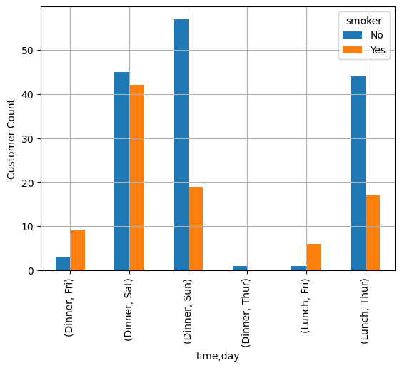 cdata = pd.crosstab([tips["time"], tips["day"]], tips["smoker"])
