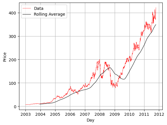 We notice how financial data has lots of ups and downs and if we zoom into the data the change from one day to the next actually tells us very little. This is why we often use rolling functions to understand the data. Here we will calculate a rolling average and plot it with the data.