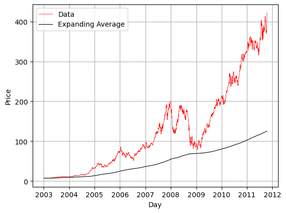 Sometimes instead of a rolling window, you want an expanding window. For example we could calculate the average as we expand our data over time. In this case the right edge of the window expands to include more data in the average.
