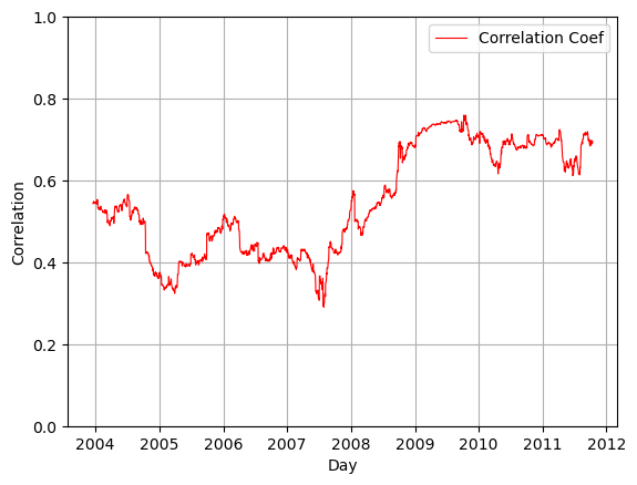 corr = pcng_aapl.rolling(250).corr(pcng_spx)plt.plot(df_resample.index,corr,'r-',linewidth=.8,label='Correlation Coef')