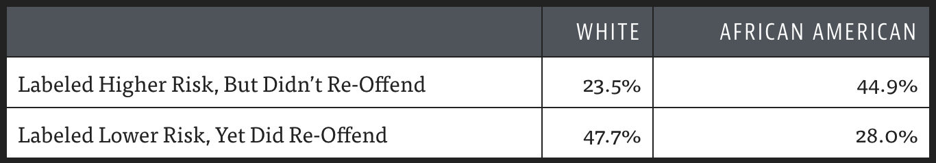 - Algorithm was more likely to falsely flag black defendants as future criminals, at almost twice the rate as white defendants