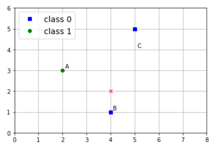 For \(k=1\text{,}\) \(B\) is the closest point to \((4,2)\text{.}\) It has class 0, so we assign the class of 0 to point \((4,2)\text{.}\)