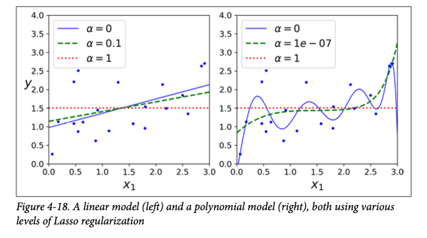 In Lasso Regression we penalize the \(l1\) norm in the cost function. Note that again the parameter \(\alpha\) changes the amount of reglarization to do.