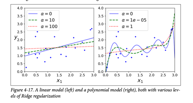 where \(MSE(\Theta)\) stands for the mean squared error cost function for Linear Regression, but would be replaced by the appropriate cost function for the given algorithm. For example, log-loss, or cross-entropy loss for logistic regression. For Ridge Regression we penalize the \(l2\) norm in the cost function. In otherwords we try to minimize the cost function with respect to \(\theta\) values, but we add a term that penalizes the cost when the \(\theta\) values are large. Here the penalty is the \(l2\) norm or Euclidean distance from orgin. (You may also see this as \(l^2\) norm, but sklearn favors \(l2\text{.}\))