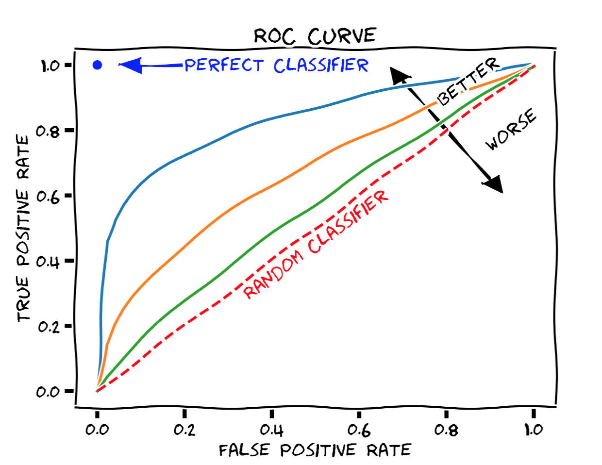 A ROC Curve (stands for Receiver Operator Characteristic Curve) is created by plotting the True Positive Rate as a function of False Positive Rate as various parameters are varied. (FPR on \(x\)-axis, and TPR on \(y\)-axis.) It was originally developed for operators of military radar receivers. In this case we are trying to find a balance between correctly detecting an event and detecting false alarms. Ideally, we want the TPR to be 100% and FPR to be 0%. However, normally as we vary parameters we can only detect all the true positives if we allow some false alarms, and we can only have no false alarms with a very poor ability to detect the desired event. Thus, we want to identify a model that corresponds to an appropriate trade-off between detection and false alarms that is determined by the given situation.