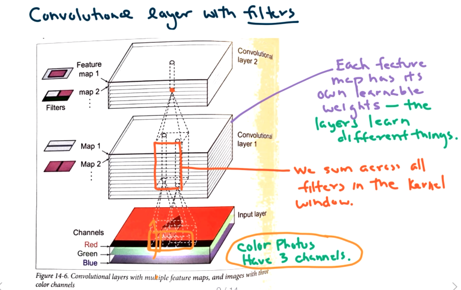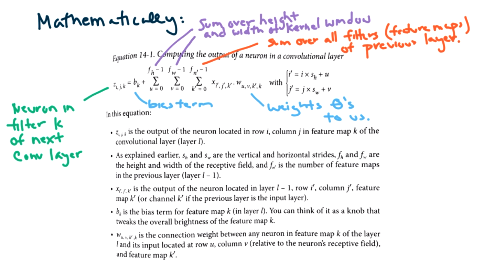 The Math! If we want to calculate what is happening in neuron \(i,j \) we must sum over height and width of kernel window and sum over all the filters.