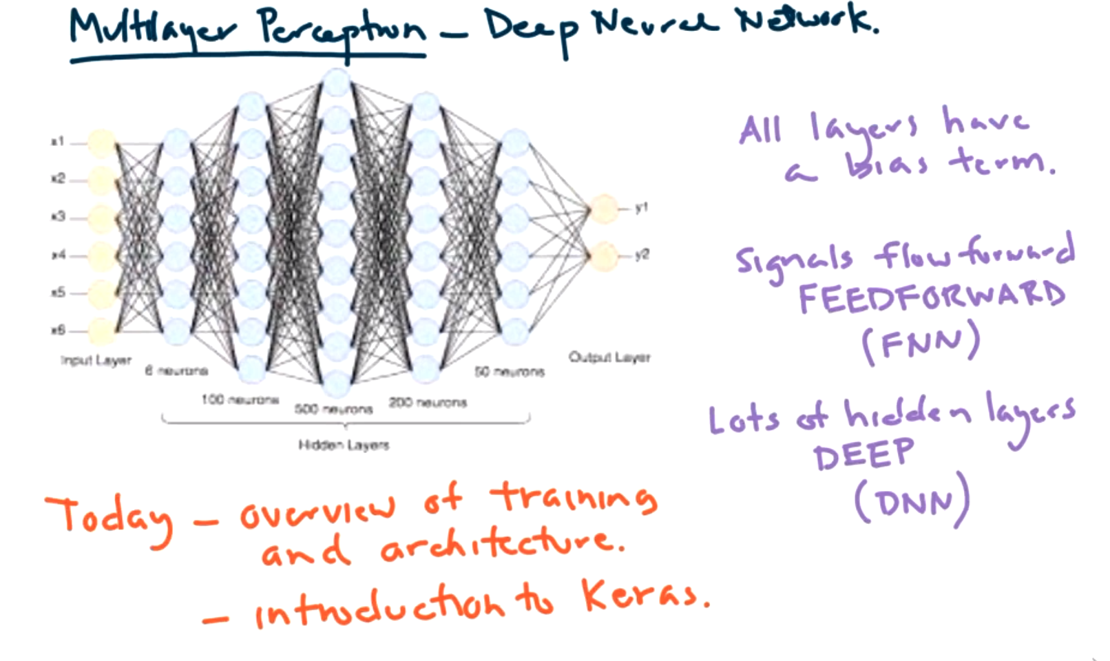 Keras is great for building neural networks and the easiest place to start for experimentation. Keras builds a model one layer at a time. Easiest way is sequential model. Always assumes outputs from one layer are the input for the next layer. [More complex models in functional API]