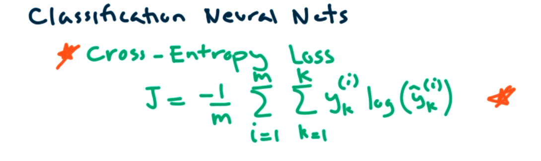 For the loss function, we want to use cross entropy loss. Remember we saw this before in logistic regression and if \(k=2\) then cross entropy loss reduces to the simpler logistic regression cost function (log-loss).