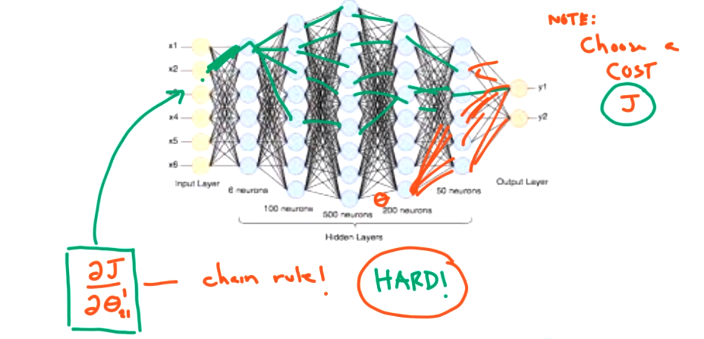 In this section we will introduce the concept of back propagation, its benefits and pitfalls, and a brief introduction to optimizers. The idea of back propagation is doing multivariable calculus on a graph. It makes training much, much faster on the scale of reducing the time from 200,000 years to one week. Its an important reason why neural networks have become so powerful. A full discussion of optimizers would involve lots of linear algebra and multivariable calculus. We aren't going to go through all of those details, but encourage you to research those details! (See references in your text.)