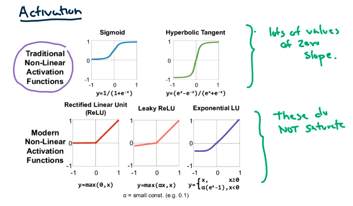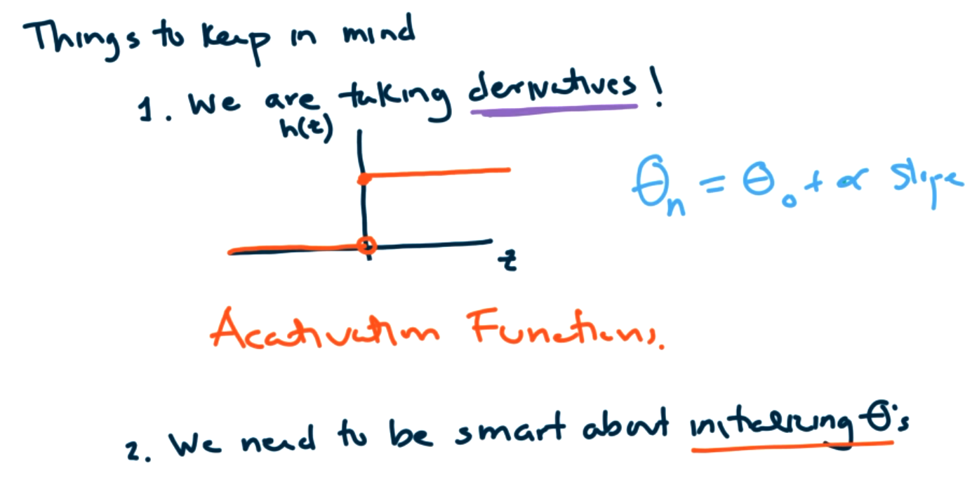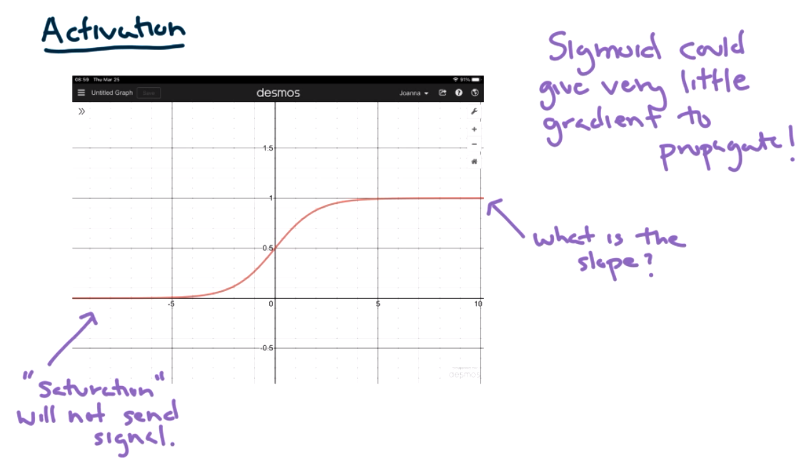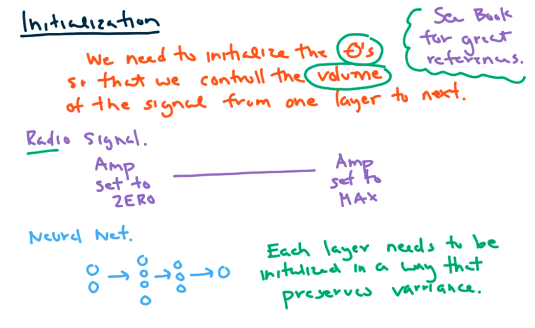 We need our signal to flow forward to give us a prediction, but backward to get an update. Need signal to flow in both directions. Makes it hard to choose a good initialization and the activation function has a huge impact on neural net. see book for references. Here's the idea: