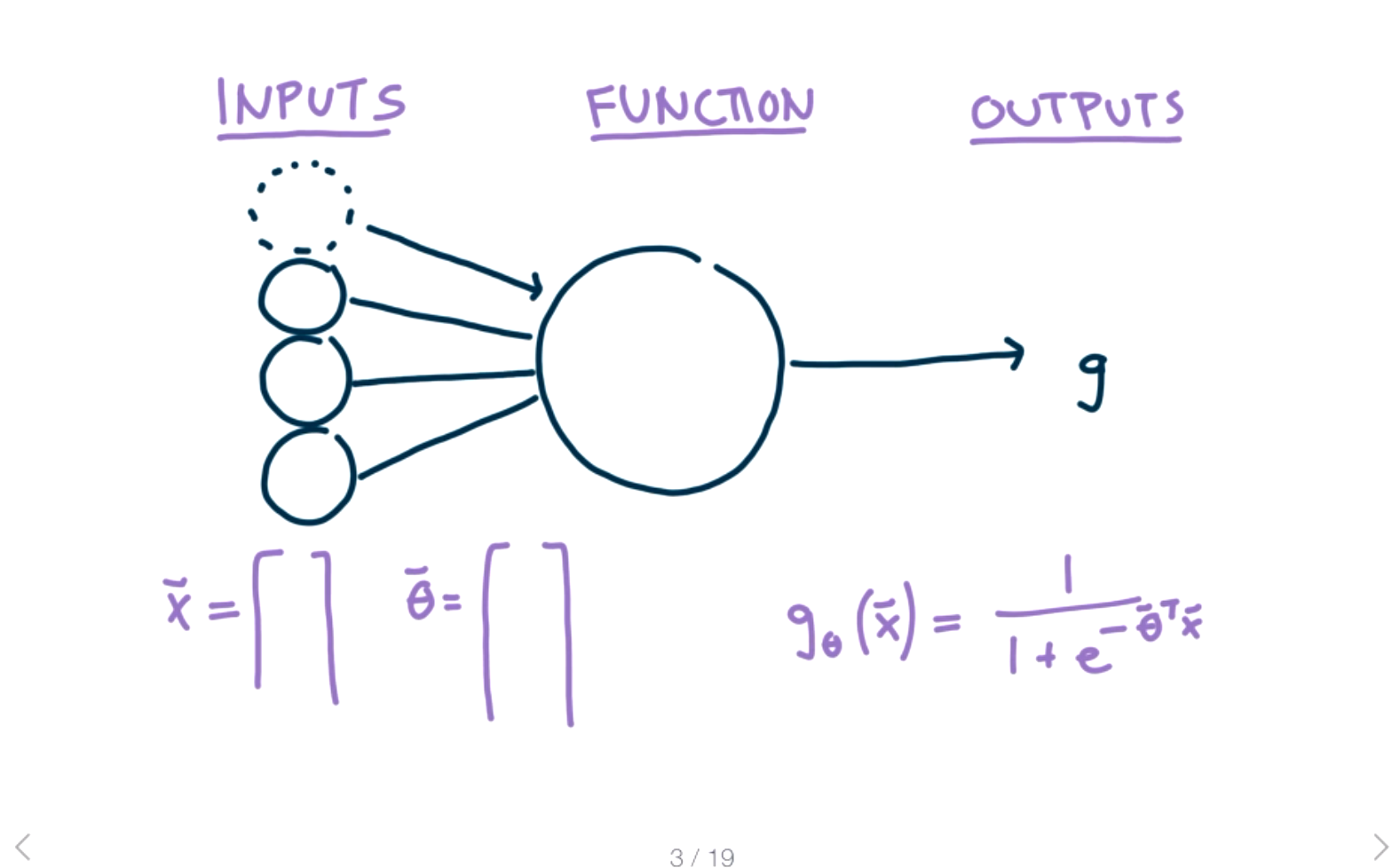 The activation function determines how strongly the neuron should react to the input, or if it should react at all. There are many different choices for the activation function, for example the hinge loss function or a linear function. However, linear functions end up being too simple, so we generally want some non-linear activation function. The output \(g\) represents the output of the activation function. In the simplest case, this will be the answer to our question of making a prediction for the input \(X\text{.}\) The first addition we are going to add to this model is to add weights to each of the inputs.