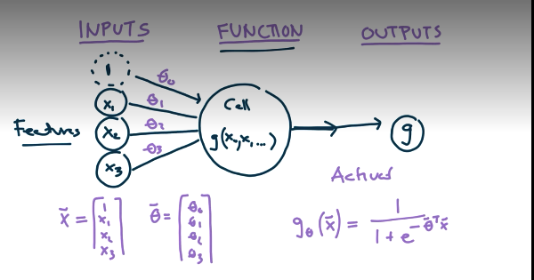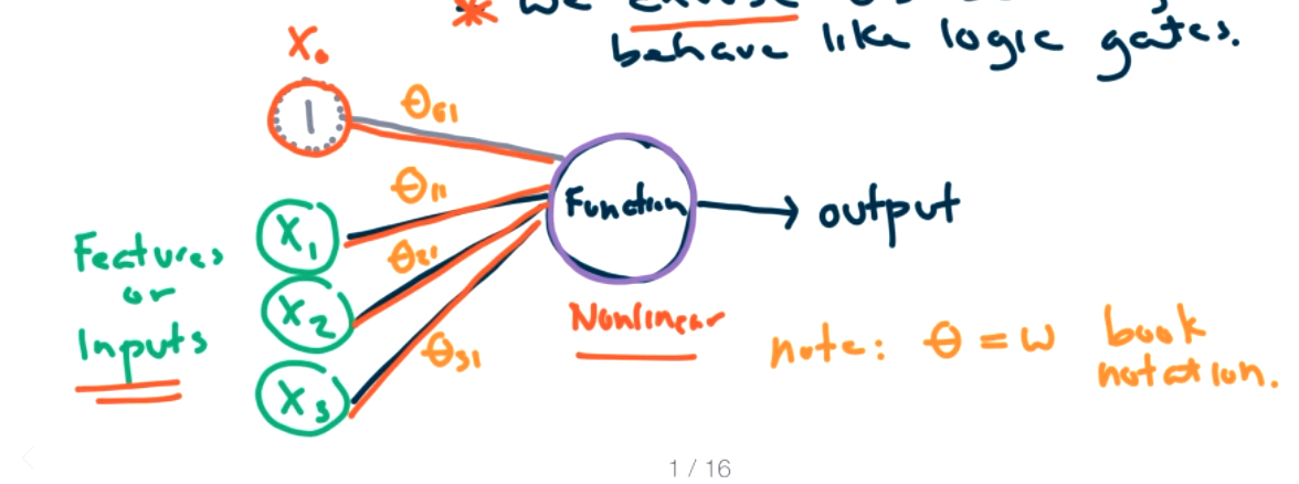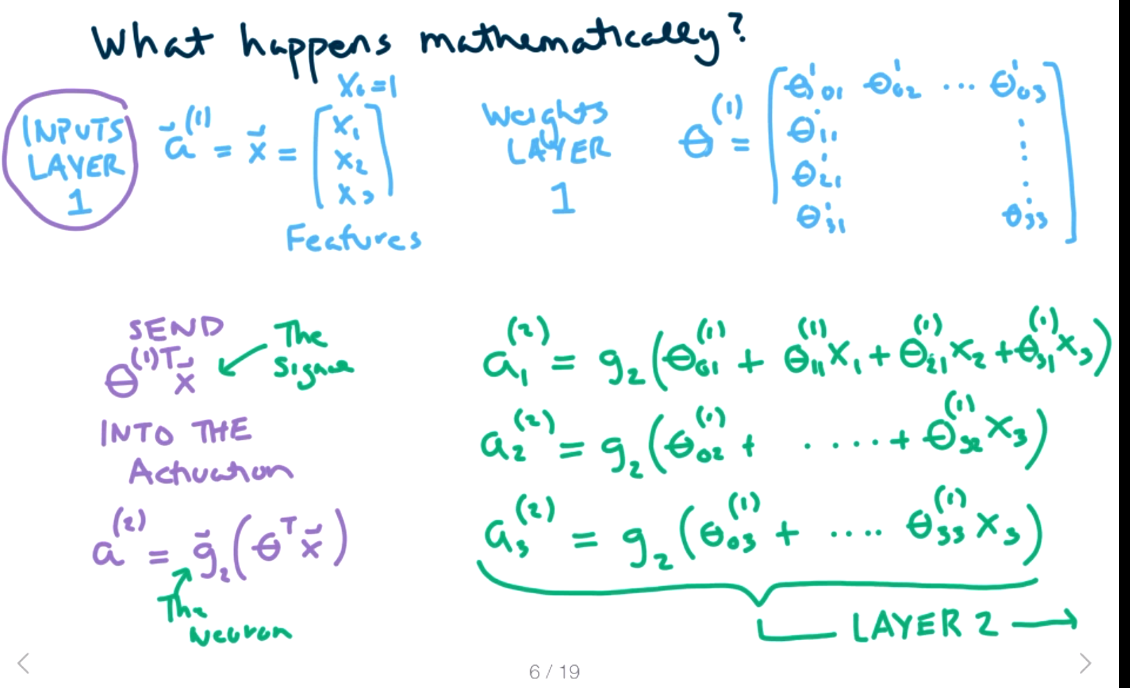 The new process is that the input features are multiplied by the \(\Theta\) values and then activated with a sigmoid function.