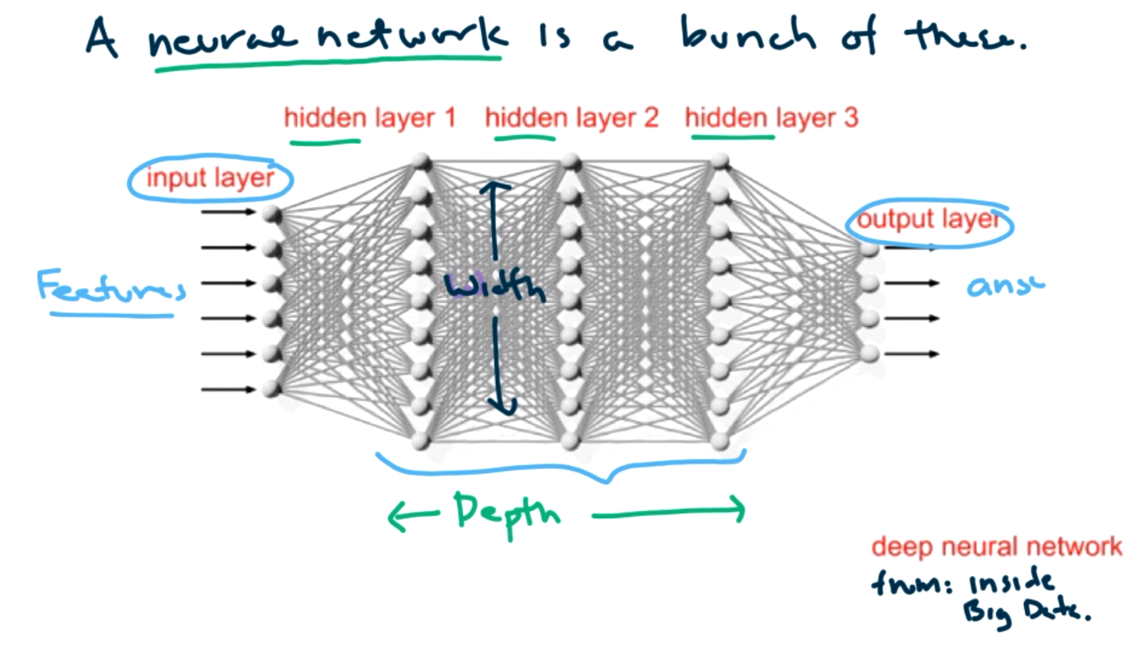 The input layer still corresponds to the features. (The bias term is still here, but it is not generally included in neural network diagrams.) In this image, there are three hidden layers, but there could be any number of these hidden layers in general. They are called hidden because the inputs and outputs of these layers are hidden inside the model. The depth refers to the number of hidden layers. The width refers to the number of neurons per layer. Each layer can have a different number of neurons. The output layer is always the last layer and corresponds “the answer”, that is, the prediction for input \(X\) based on our model. At each layer, the outputs from the previous layer are the inputs for the next layer. The \(\Theta\) values correspond to the weights on each of the lines between layers.