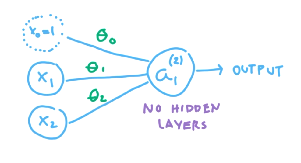 Yay, it works! Thus our activation function \(g(-10+20x_1+20x_2)\) will produce the same output as OR in all cases for two features. Construct explicit \(\Theta\) values that will produce the same function as x1 AND x2 for a two layer neuron with two input features.