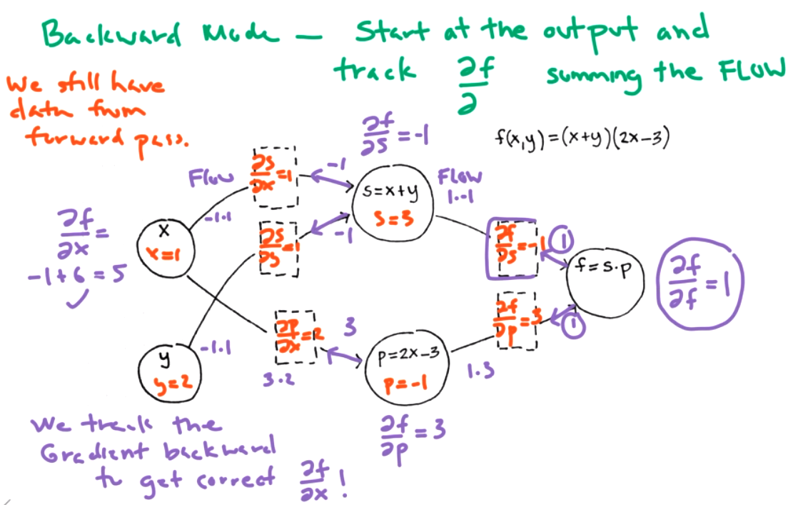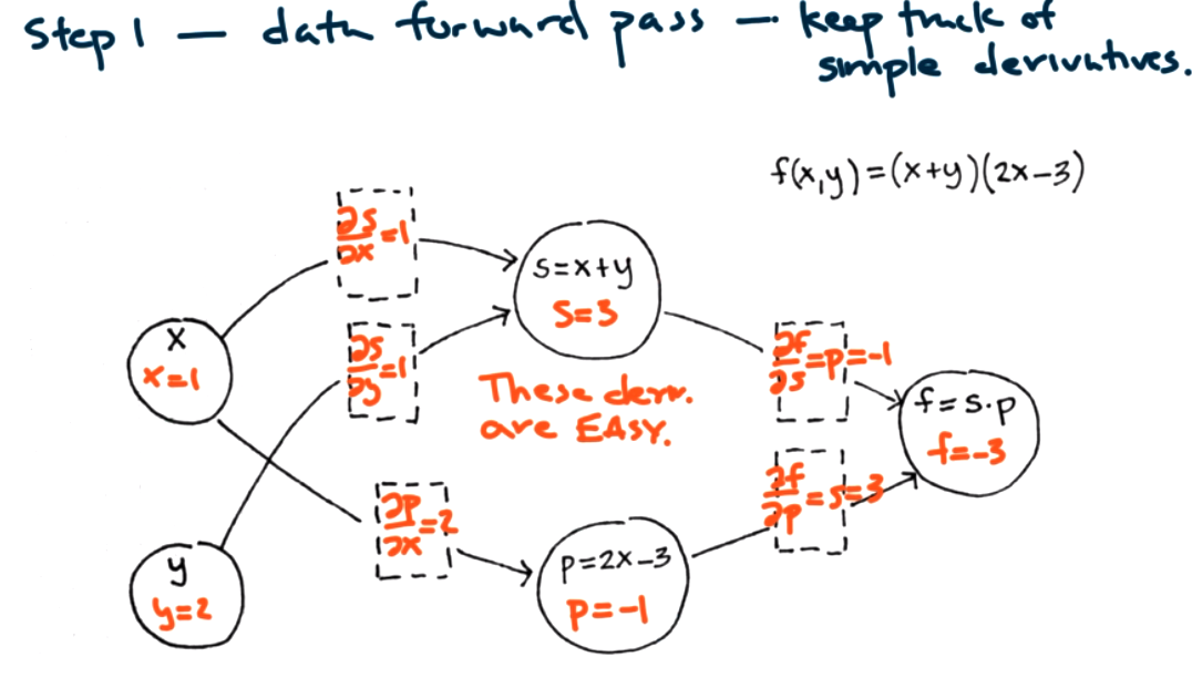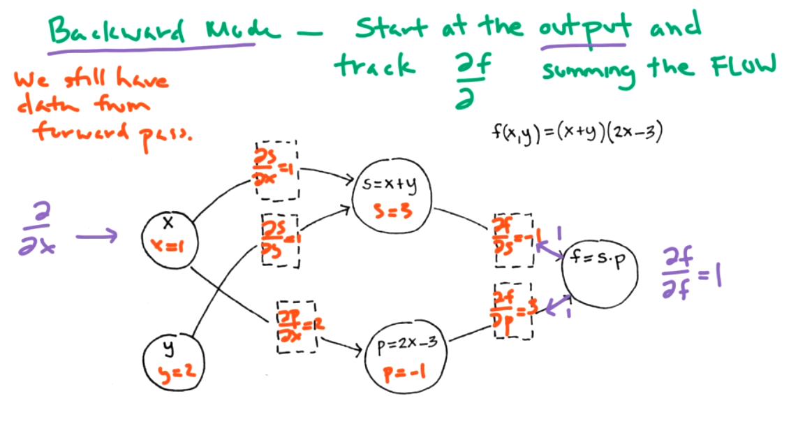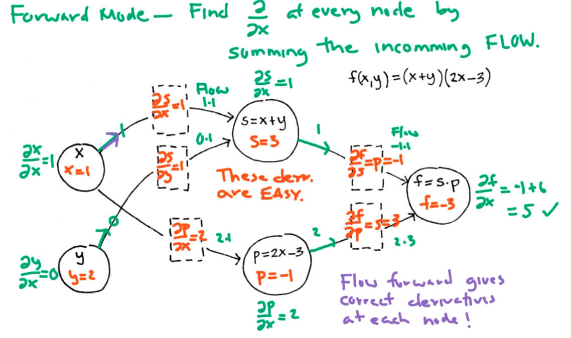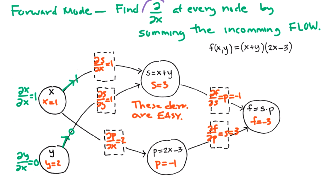 Both modes can help us find \(\frac{\partial f}{\partial x}\) at a point \((x,y)=(1,2)\text{.}\) Step 1: data forward pass -- keep track of simple derivatives store information about simple derivatives.