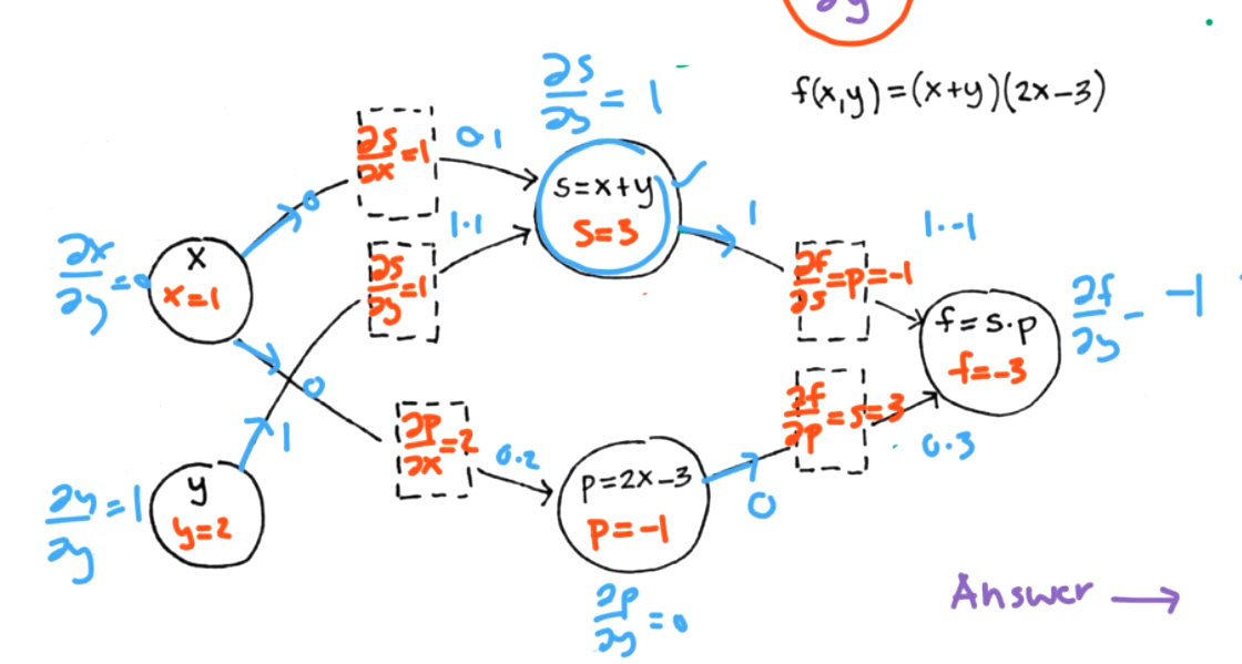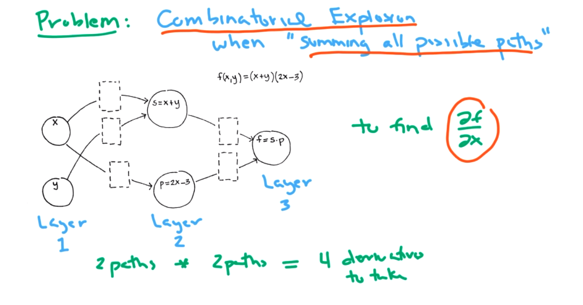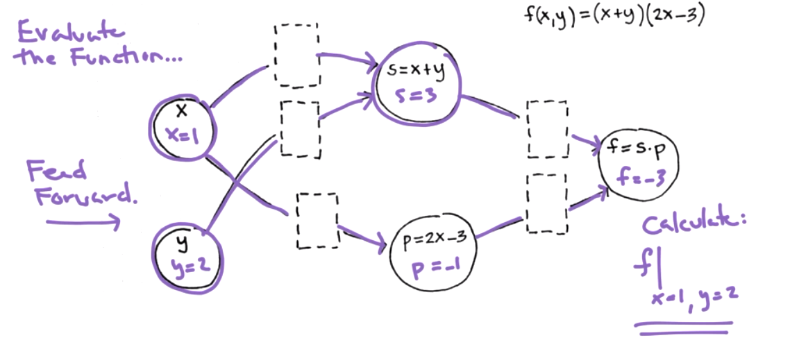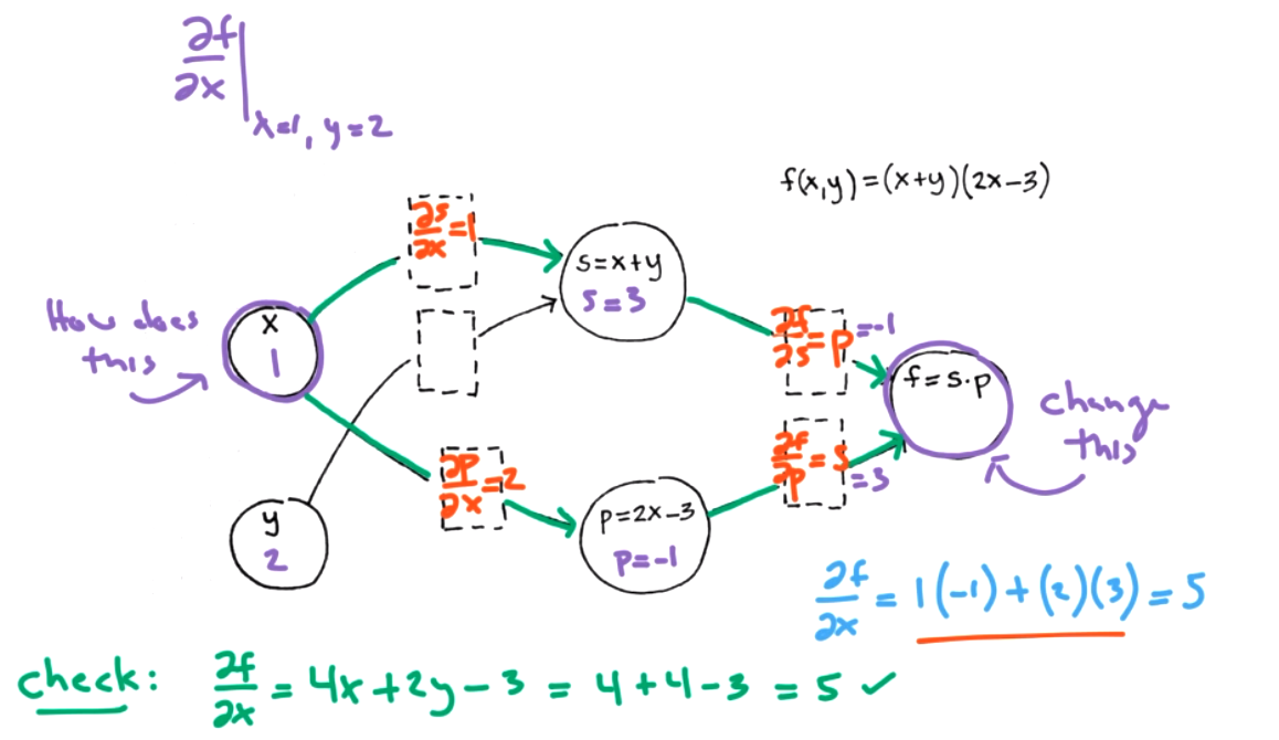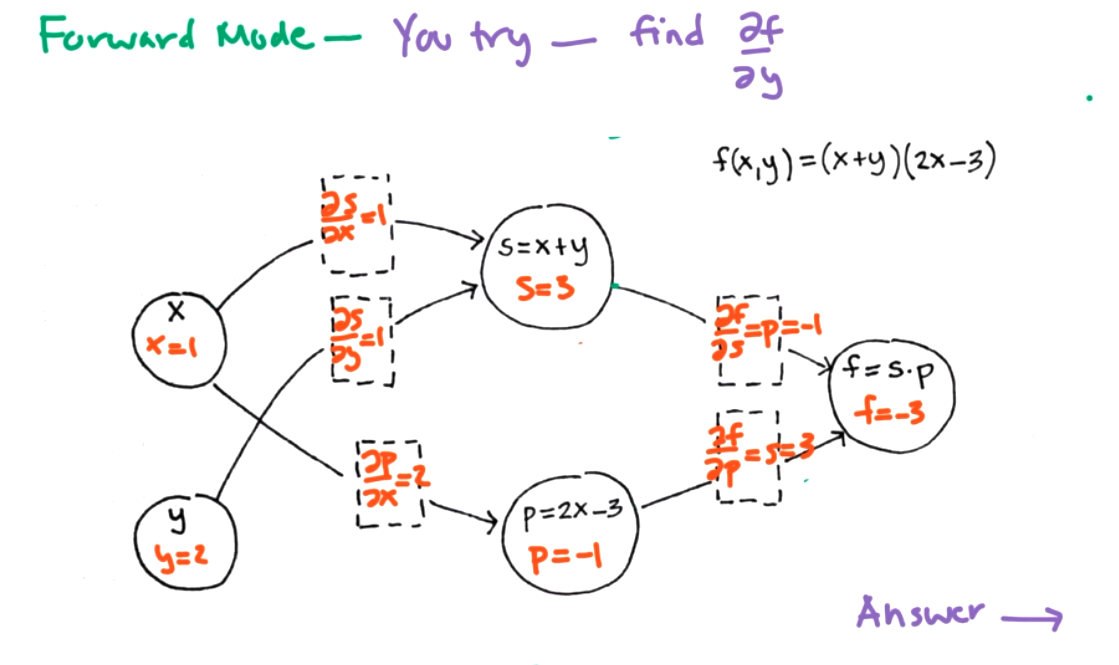 Both modes can help us find \(\frac{\partial f}{\partial x}\) at a point \((x,y)=(1,2)\text{.}\) Step 1: data forward pass -- keep track of simple derivatives store information about simple derivatives.