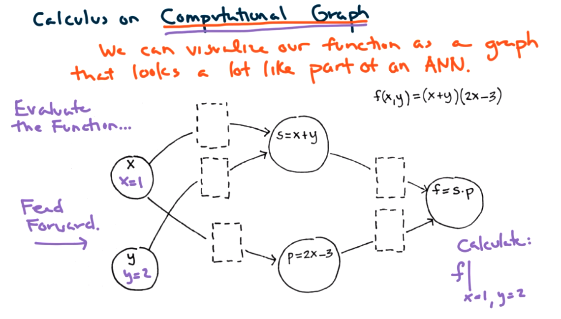 We can visual the functions and derivatives as a graph to connect this idea to neural networks. The chain rule is easier for computer. Algebraic simplificaiton requires symbolic algebra. The functions correspond to nodes.