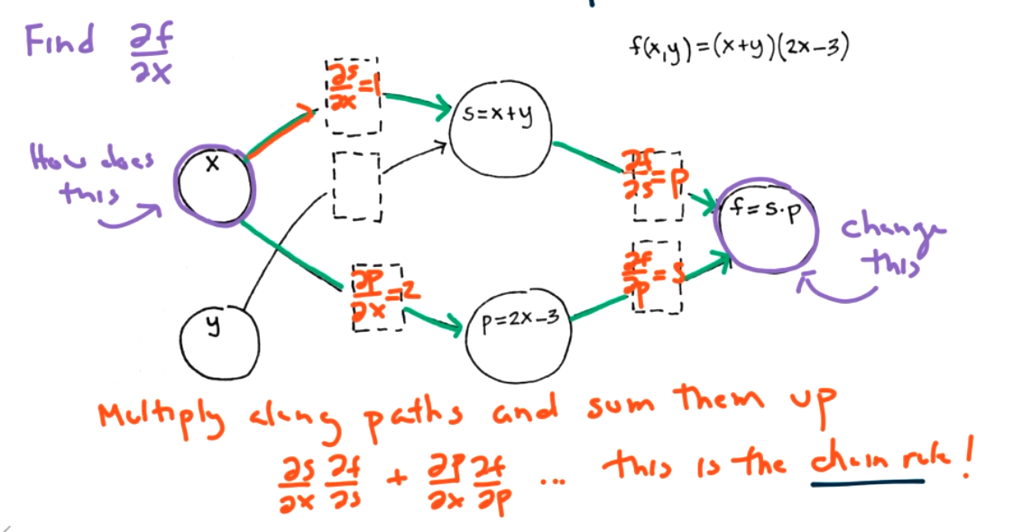 Suppose \(f(x,y) = s(x,y) p(x)\) where \(s(x,y)=x+y\) and \(p(x)=2x-3\text{.}\) There are two ways we can calculate derivates, we can use the chain rule or we can use algebraic simplification. For the chain rule