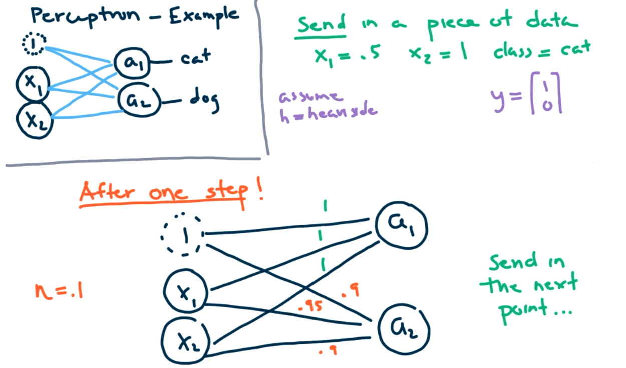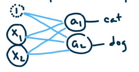 - Perceptron makes prediction \(\hat{y} = \left[ \begin{matrix} a_1 \\ a_2 \end{matrix} \right]\)