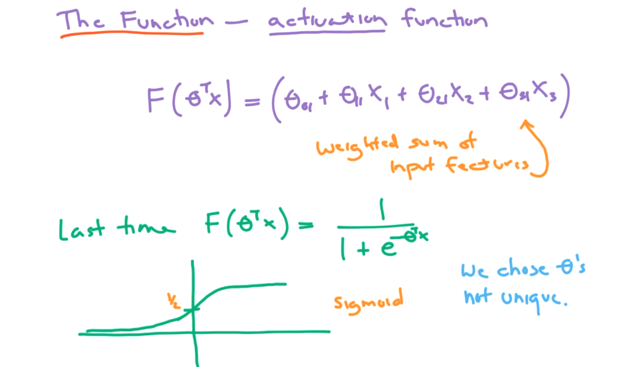 The activation function we used was a weighted sum of input features and the goal was to learn the weights, or choose the weights appropriately.