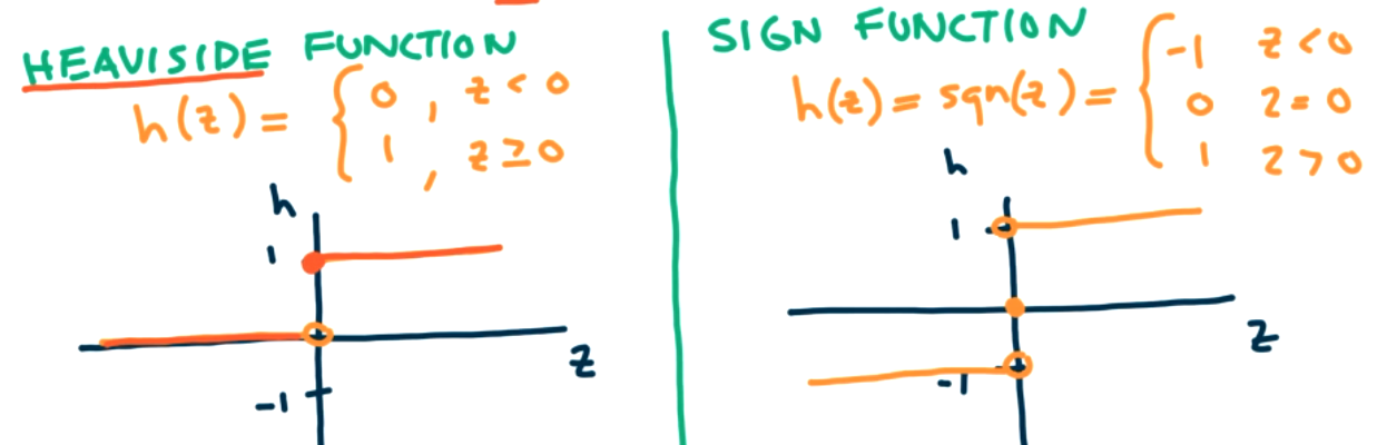 For a perceptron, also called a threshold logic unit (TLU), we will use a different activation. We will use a step function. Two options for a step function are the heaviside function and the sign function.