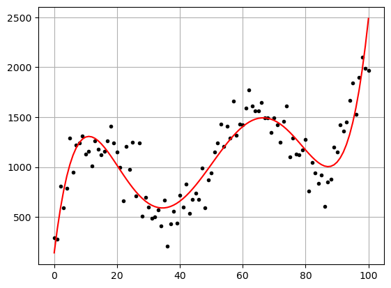 On about days 11 and 66 we see local maximums in the data. The predicted sales for these days are about 1308 and 1494 respectively. These are the biggest bumps in your sales over the first 100 days, but we see that the trend is moving upward as we go to days 100 and beyond. On day 100 we see a global max, when you sell about 2488 items.