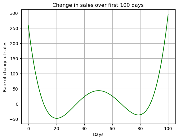 We see that the biggest increases and decreases are at the beginning and end of the time frame. This might mean that you do a good job of advertising your product in the first 11 days, but then something about your roll-out starts to be less effective. After about day 87 it seems that sales are taking off and the as the rate of change increases.