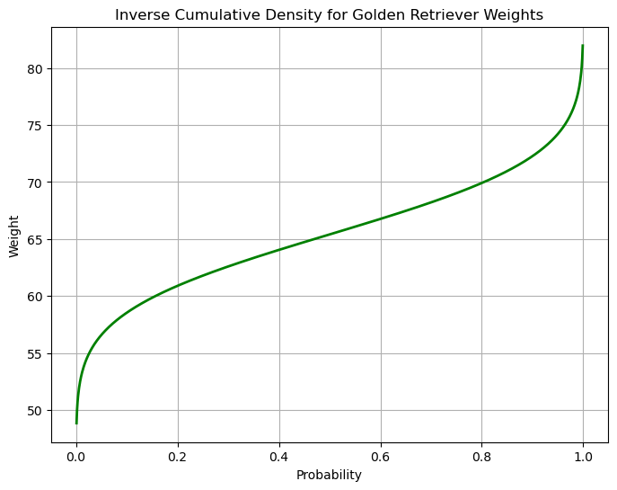 plt.xlabel('Probability Density for Golden Retriever Weights')