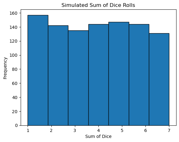plt.hist(sums, bins"Simulated Sum of Dice Rolls")