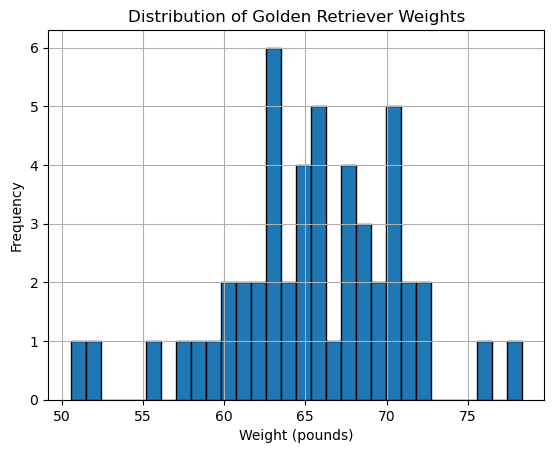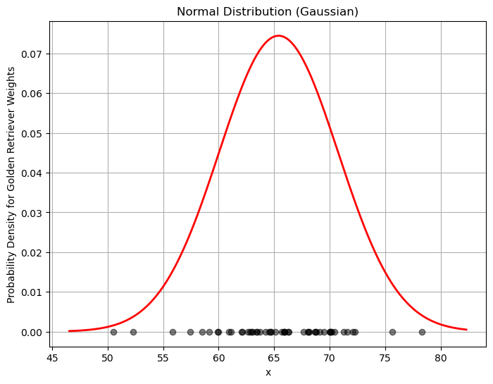 Let’s say we sample the weight of 50 adult golden retrievers and plot them on a number line.