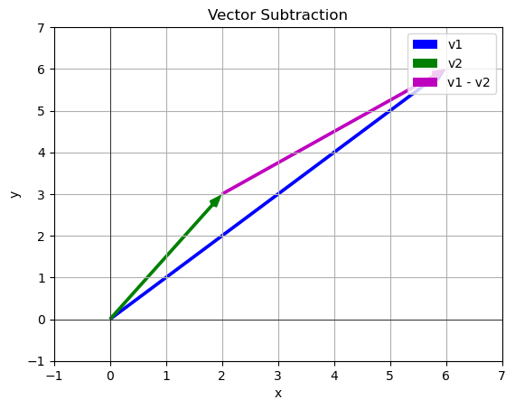 plot_vector(v2, color=(v2[0],v2[1]), color='m', label='v1 - v2')