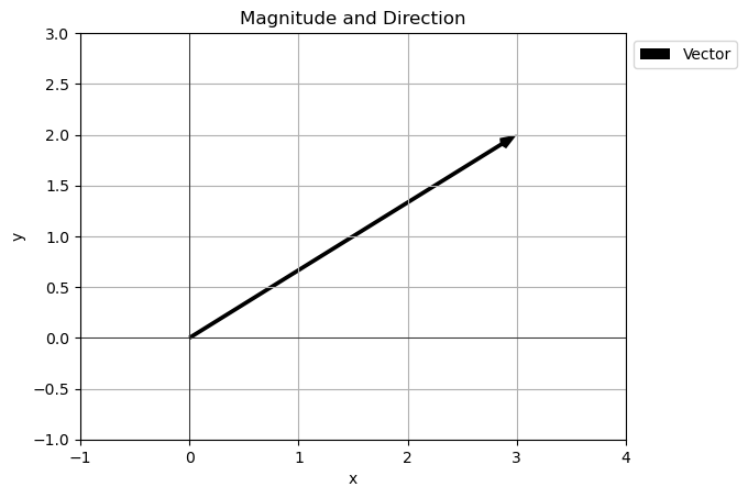 """Calculates and prints the magnitude and direction of a vector, and plots it."""