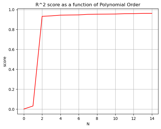 plt.grid()'R^2 score as a function of Polynomial Order')