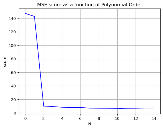plt.grid()'MSE score as a function of Polynomial Order')