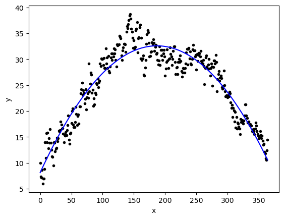 \[ y = \beta_0 + \beta_1 \sin\left(\frac{\pi x}{365}\right) = \beta_0 + \beta_1 x_1\]
