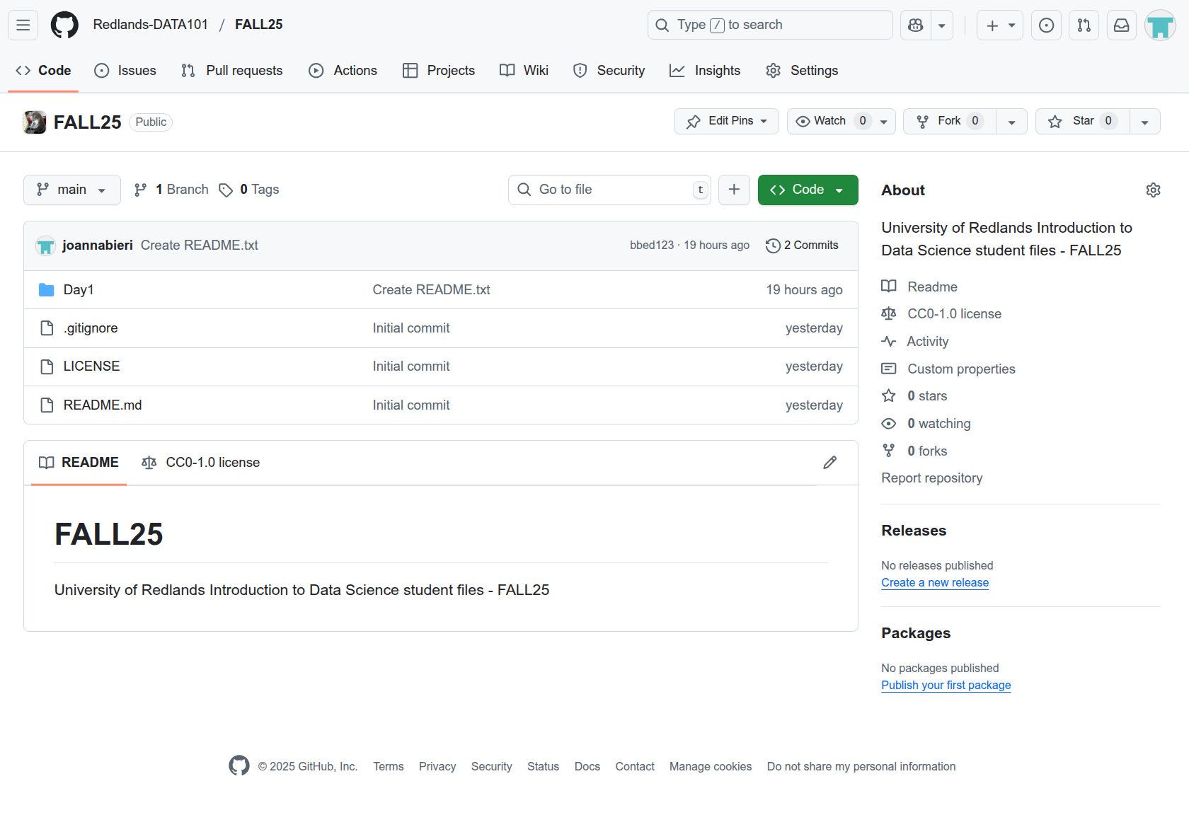 GitHub Home Repo This will send you to a page that you can fill out to create your repo. You should enter a file name that is easy to search for and different from FALL25. You can choose to make your repo public or private. I usually add a README file and choose a Python .gitignore.