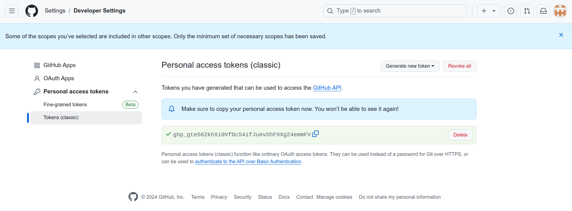 Scroll to the bottom and click the green generate token button. You should see something like:
