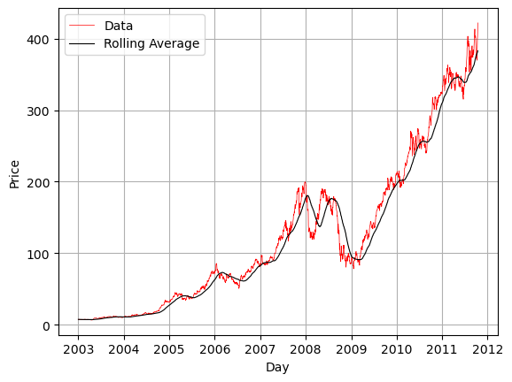 We notice how financial data has lots of ups and downs and if we zoom into the data the change from one day to the next actually tells us very little. This is why we often use rolling functions to understand the data. Here we will calculate a rolling average and plot it with the data.