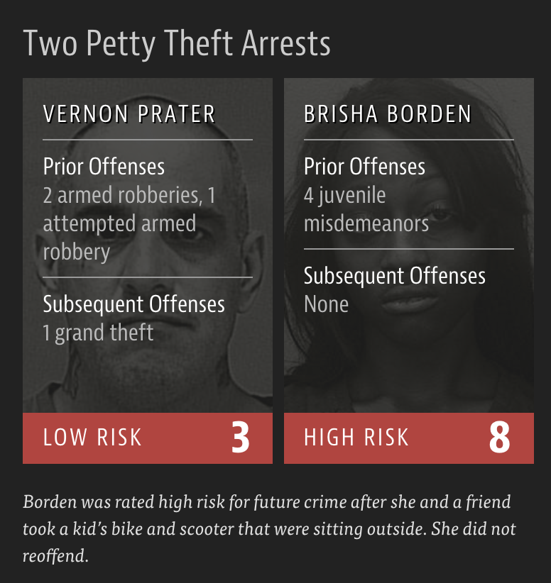 - Algorithm was more likely to falsely flag black defendants as future criminals, at almost twice the rate as white defendants