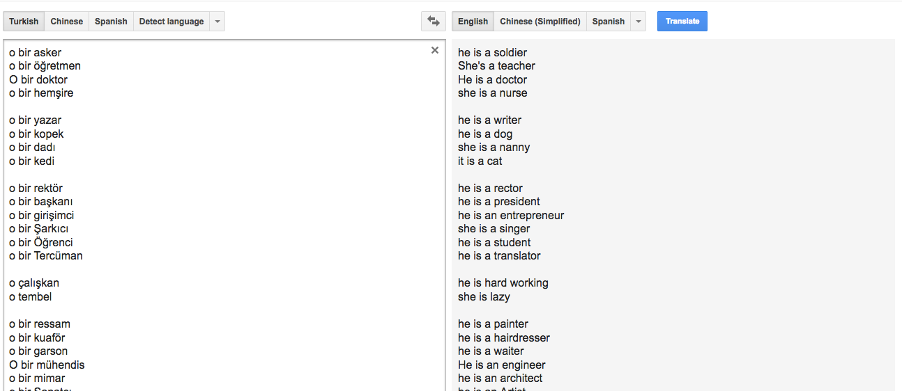 It is having to choose a gender when translating. How did it do? Do you notice some things that are biased?