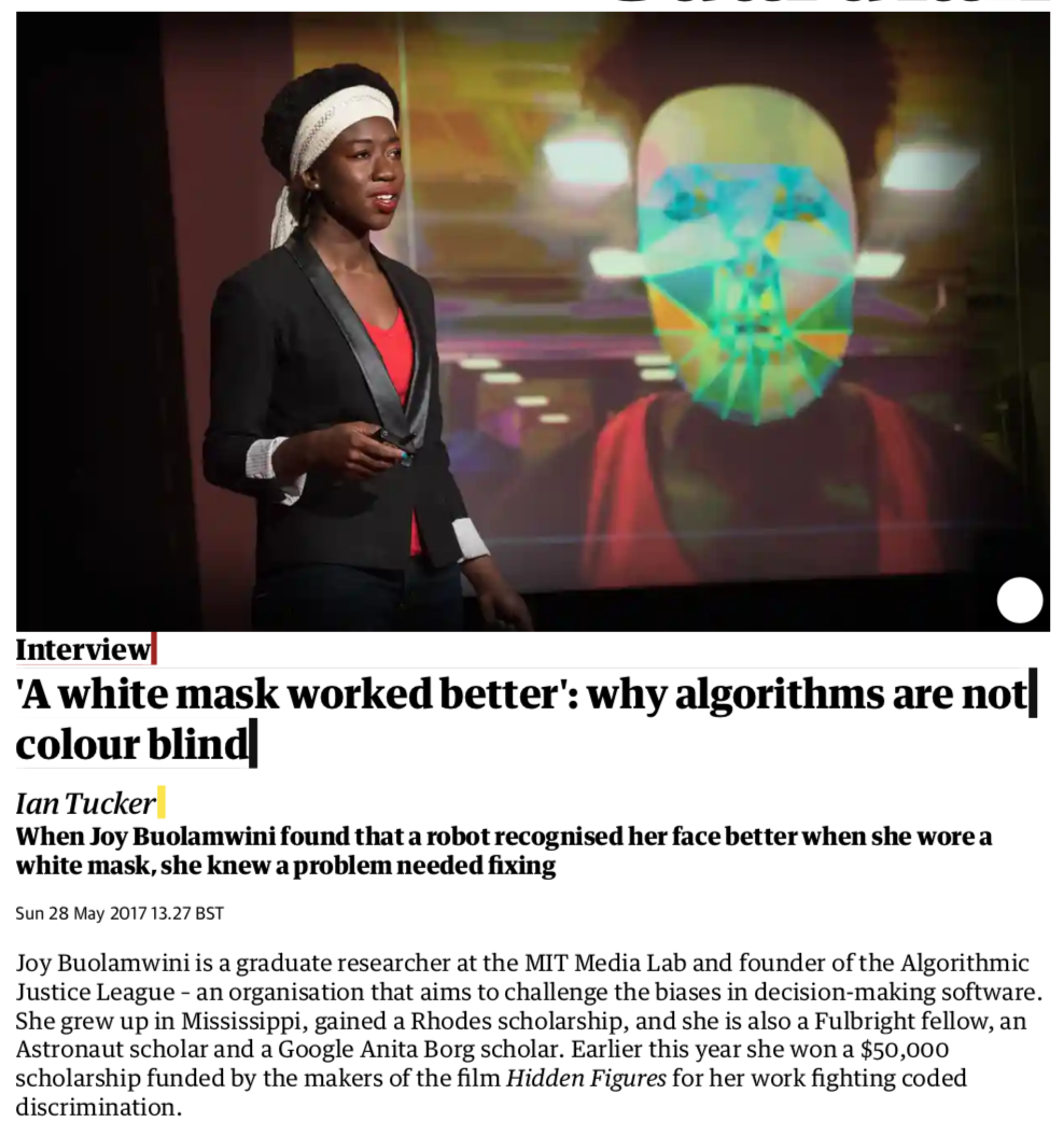 Ian Tucker. ‘A white mask worked better’: why algorithms are not colour blind. The Guardian. 28 May 2017.