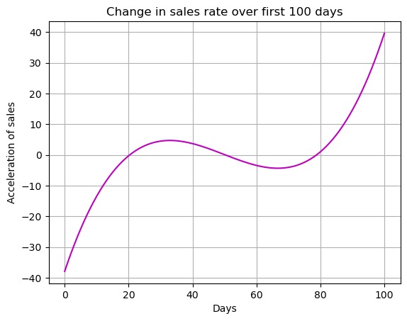 We see that the biggest increases and decreases are at the beginning and end of the time frame. This might mean that you do a good job of advertising your product in the first 11 days, but then something about your roll-out starts to be less effective. After about day 87 it seems that sales are taking off and the as the rate of change increases.