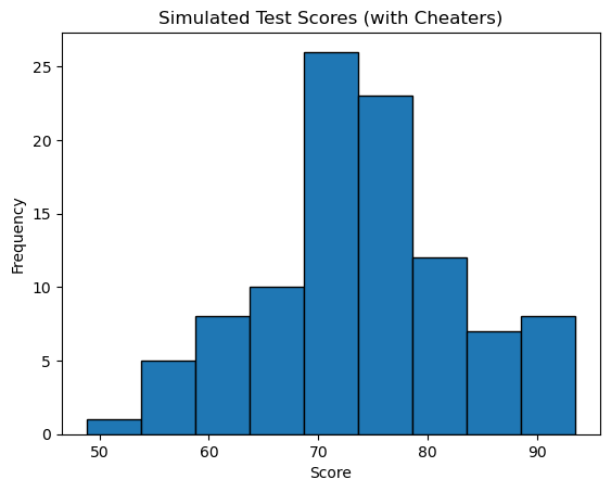 plt.hist(scores, bins"Simulated Test Scores (with Cheaters)")