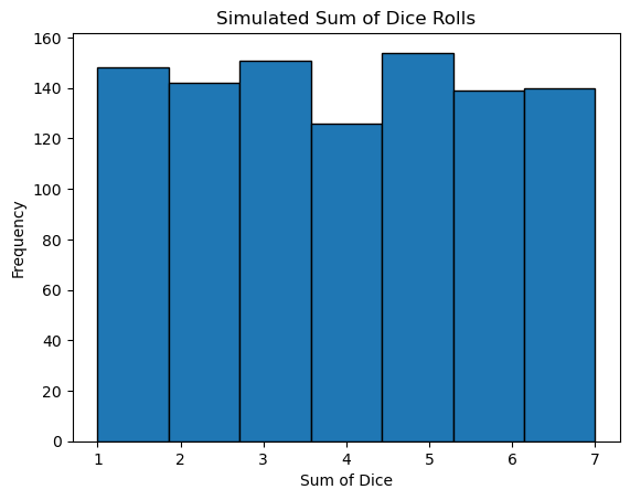 plt.hist(sums, bins"Simulated Sum of Dice Rolls")