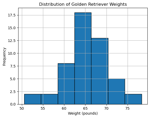 Here we see that there are more values toward the center, around 50-70 pounds than at the edges. We could also plot this data on a histogram!