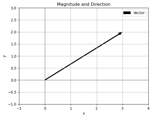"""Calculates and prints the magnitude and direction of a vector, and plots it."""