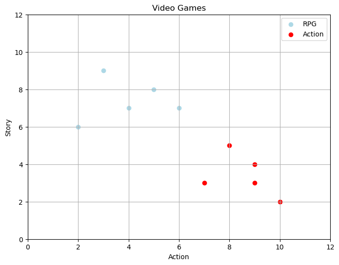Consider the video game data below. Imagine you survey 10 video game enthusiast and ask them to say what kind of game they prefer and rank the amount of action and story content they like to have in a game. Now we are going to use this data to build a system that will recommend a game type to a new player based on their scores for action and story.