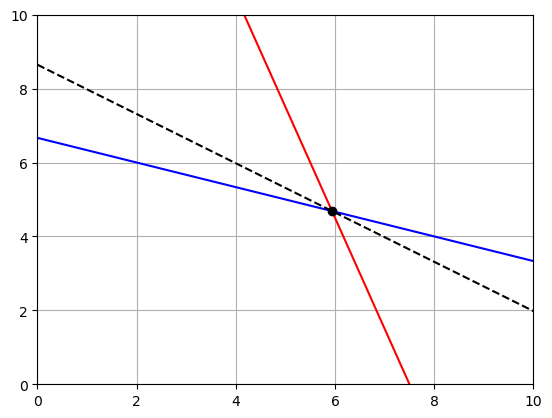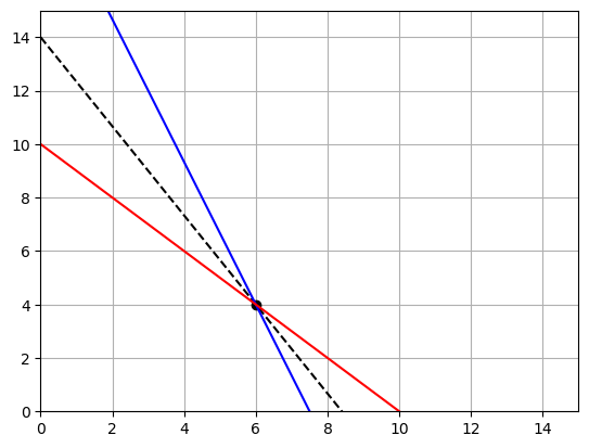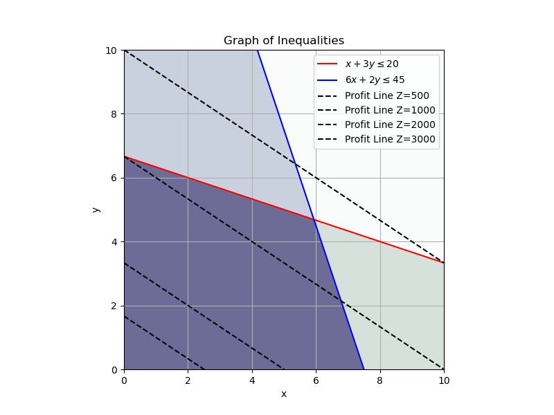 NOTE you should check all possible intersection points. In this case we could also check the profit for the points \((0,20/3)\) and \((7.5,0)\). In the picture we can clearly see that we would have to move our profit line down to reach these points.